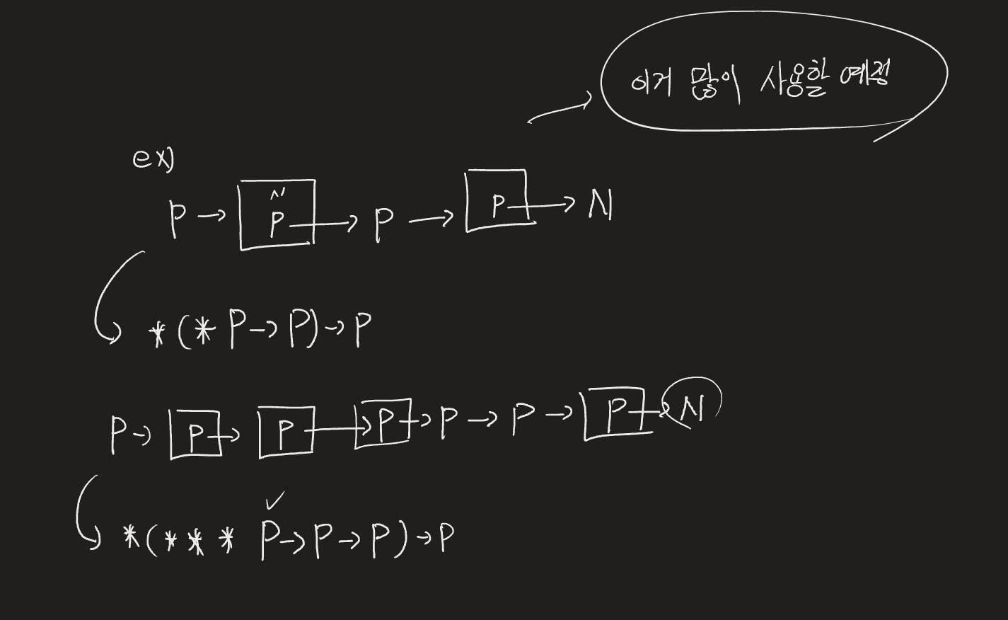 첫 번째 예시는 *(*p->p)->p / 두 번째 예시는 *(***p->p->p)->p에 대한 것이다.